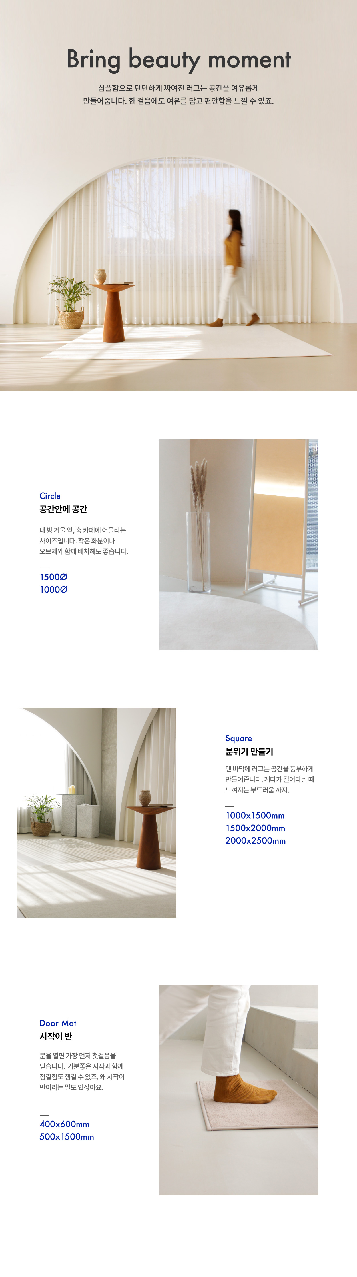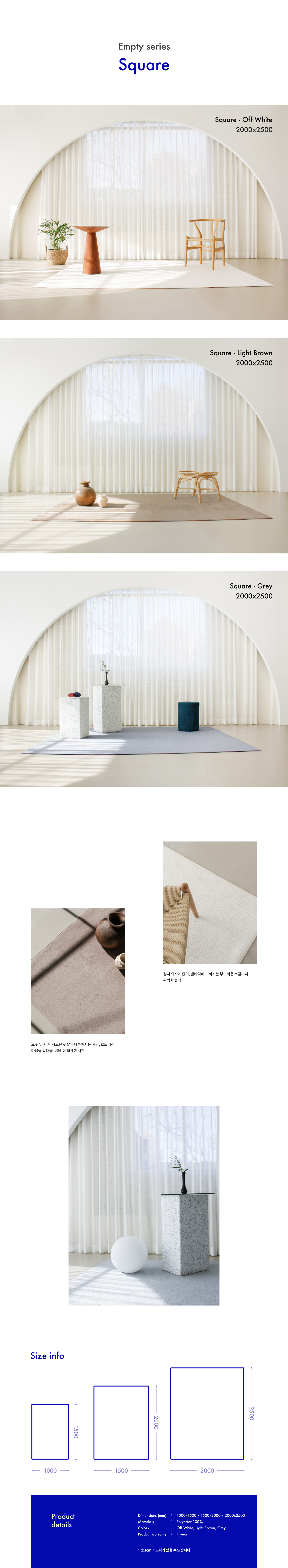 가장 미니멀한 스타일의 러그입니다. 편안한 색감에 부드러운 촉감으로 어느 공간이나 무리 없이 어울립니다. 4계절 관리를 위한 물세탁도 가능한 라익디스의 스테디셀러 아이템입니다.