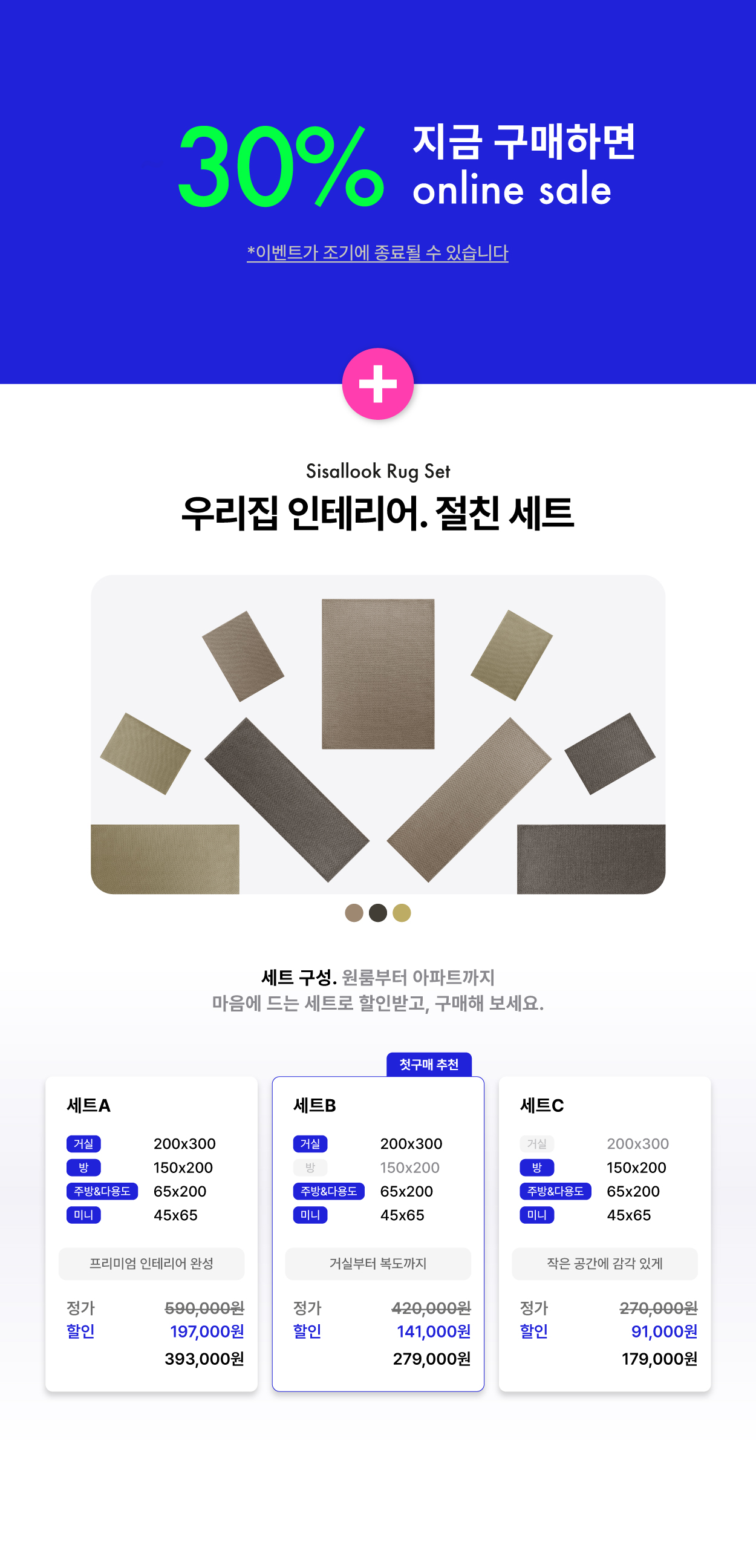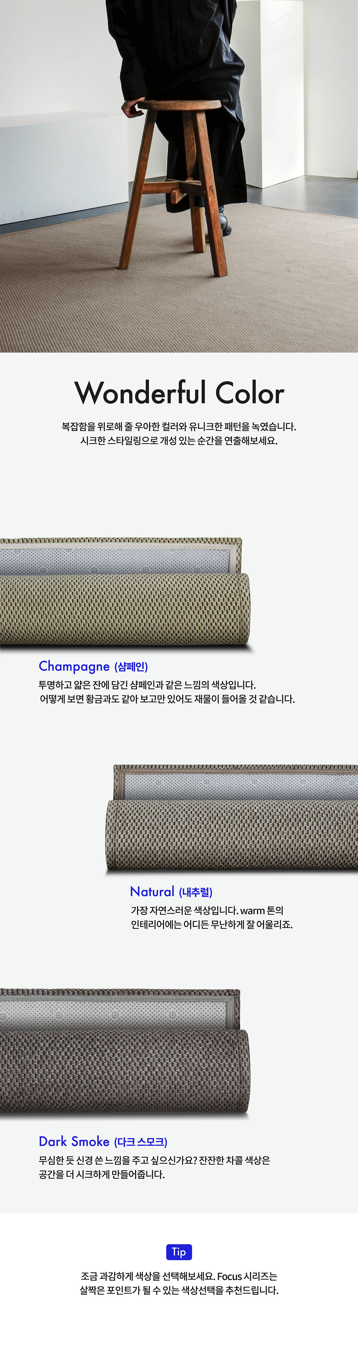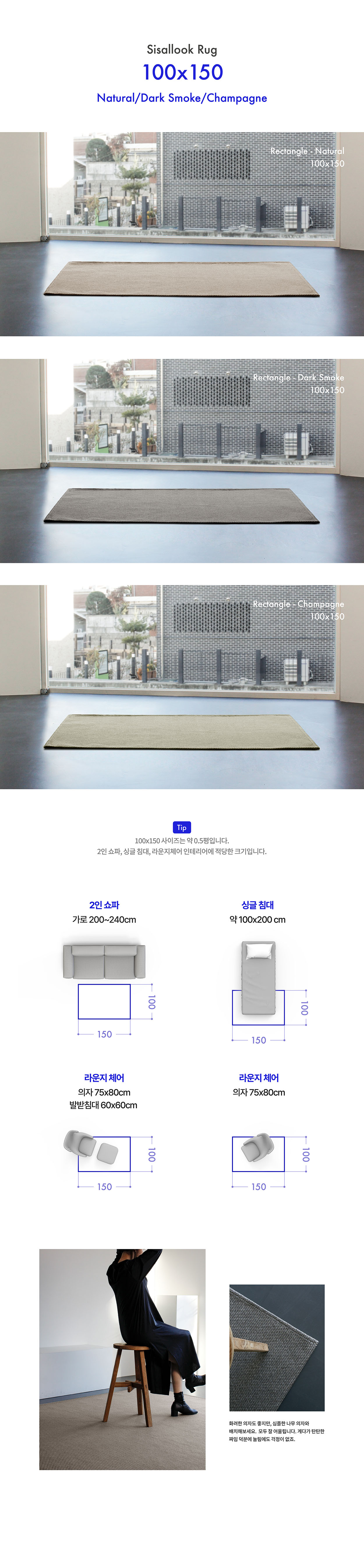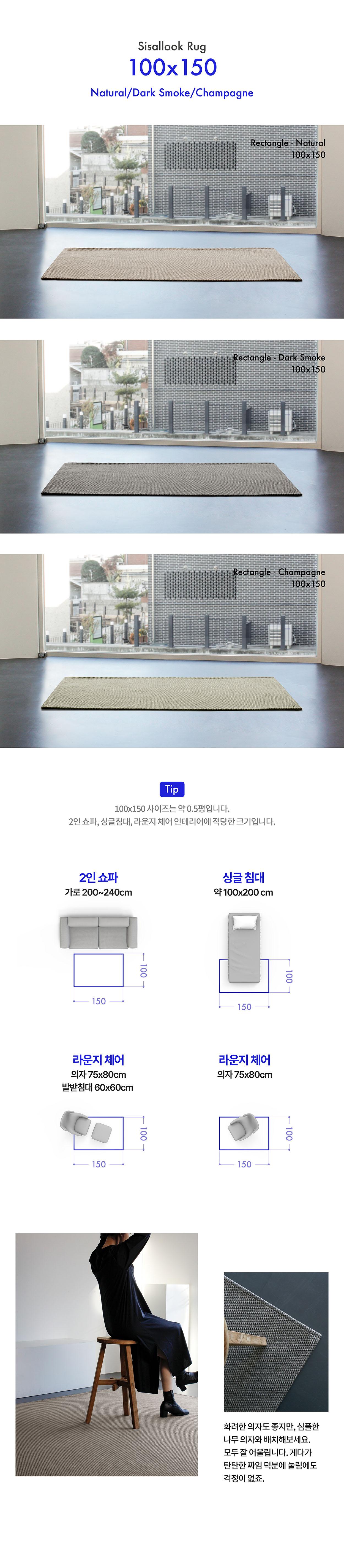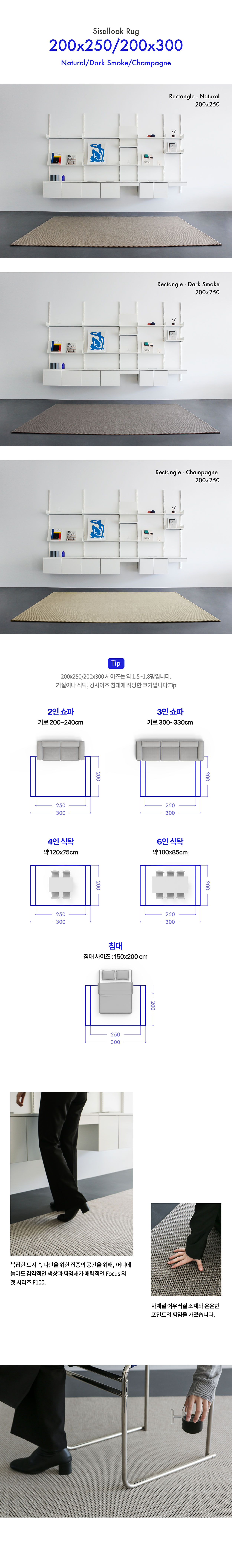 디자인과 내구성을 모두 만족시키기 위해 3가닥으로 신중한 짜여진 사이잘룩 러그입니다. 통기성이 좋고 물세탁이 가능해 4계절 내내 사용하기에 무리 없이 좋습니다. 원사의 소재인 Polyester는 의료용으로 사용될 만큼 안전하고 내구성이 좋은 소재입니다.